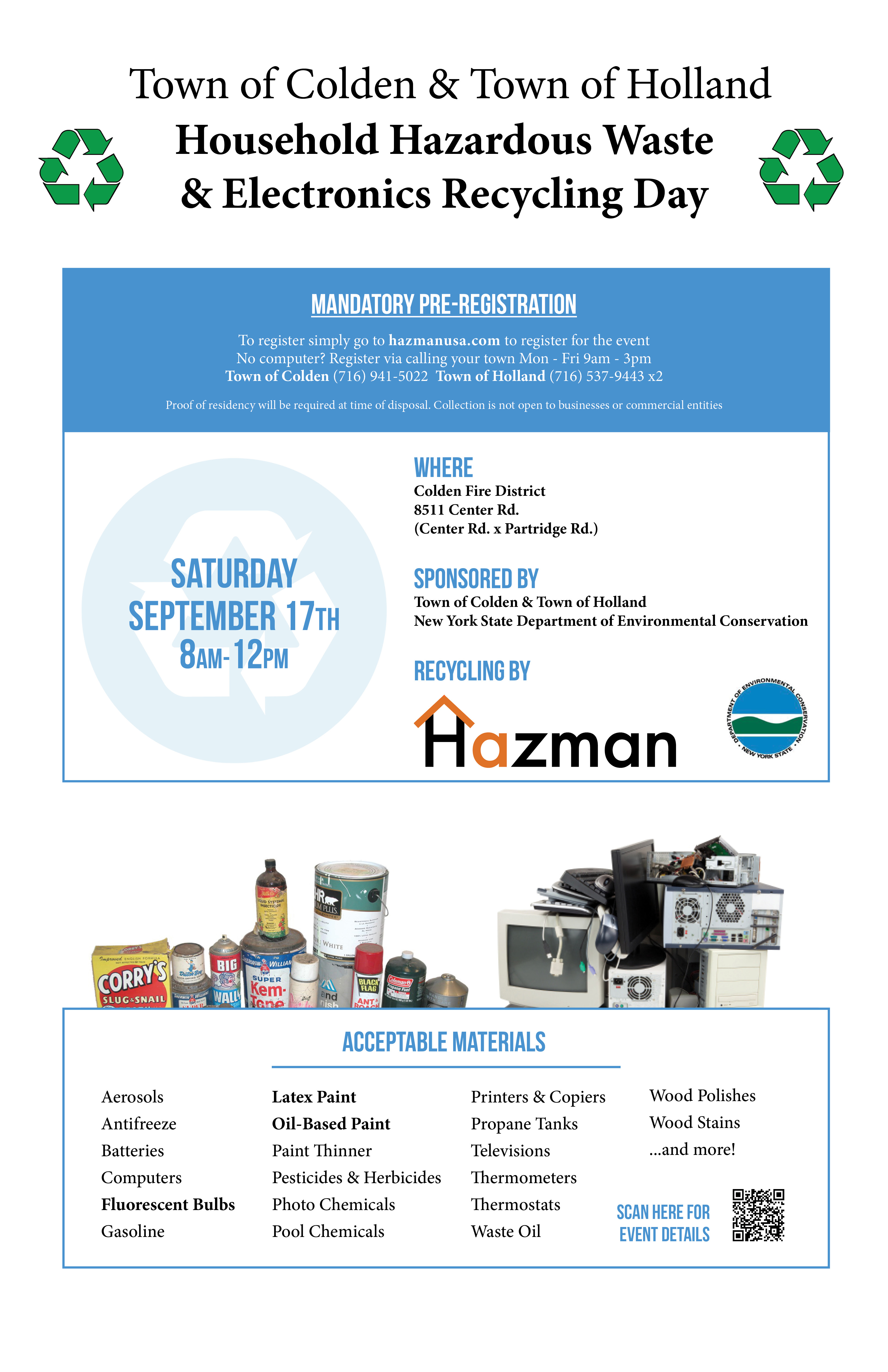 The Town of Colden and Town of Holland are partnering up for a Household Hazardous Waste and Electronics Collection event for their residents! NO commerical or businesses allowed to participate. If you are a business looking to dispose of material please contact Hazman directly via Info@Hazmanusa.com.