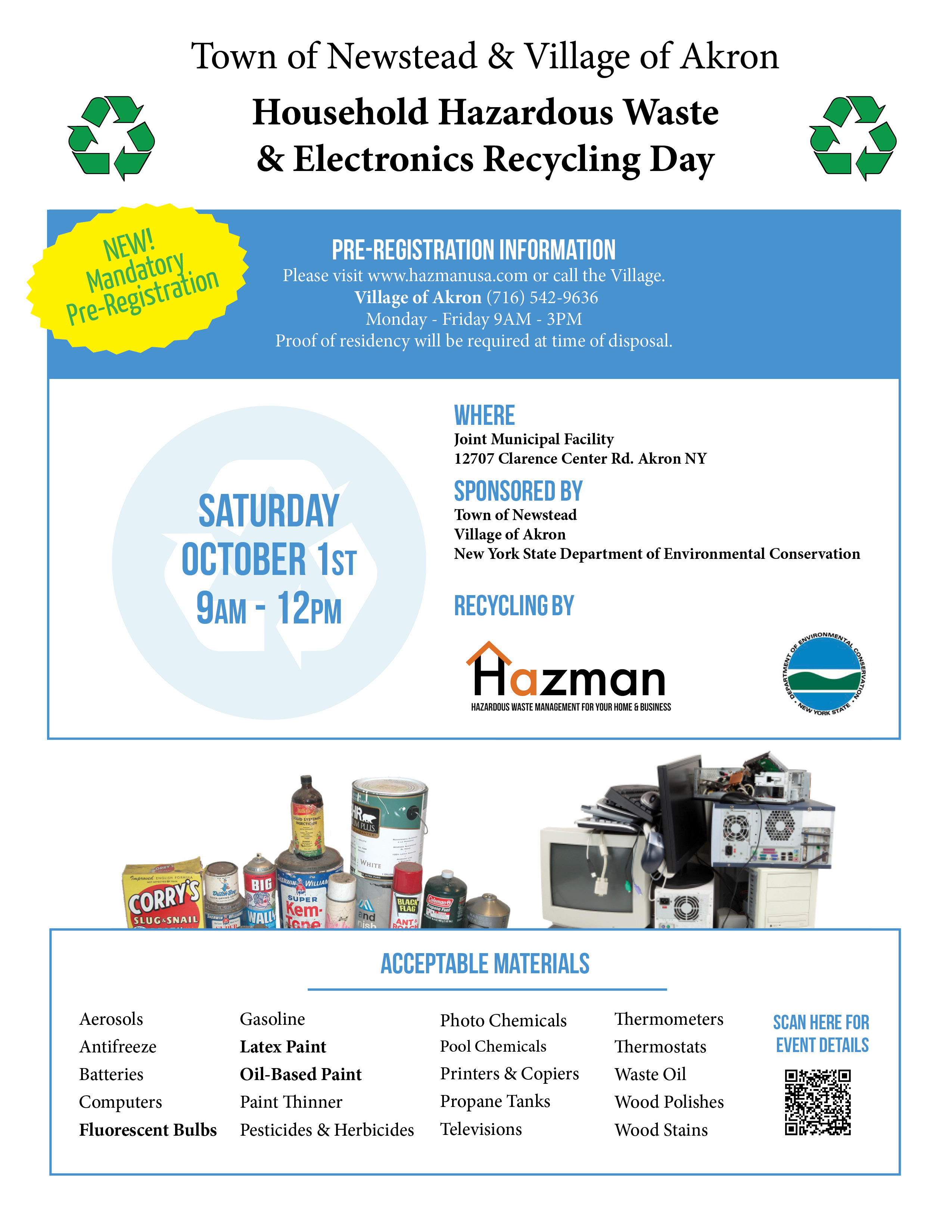 The Village of Akron and Town of Newstead are offering a free Household Hazardous Waste Collection Event for their residents.